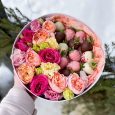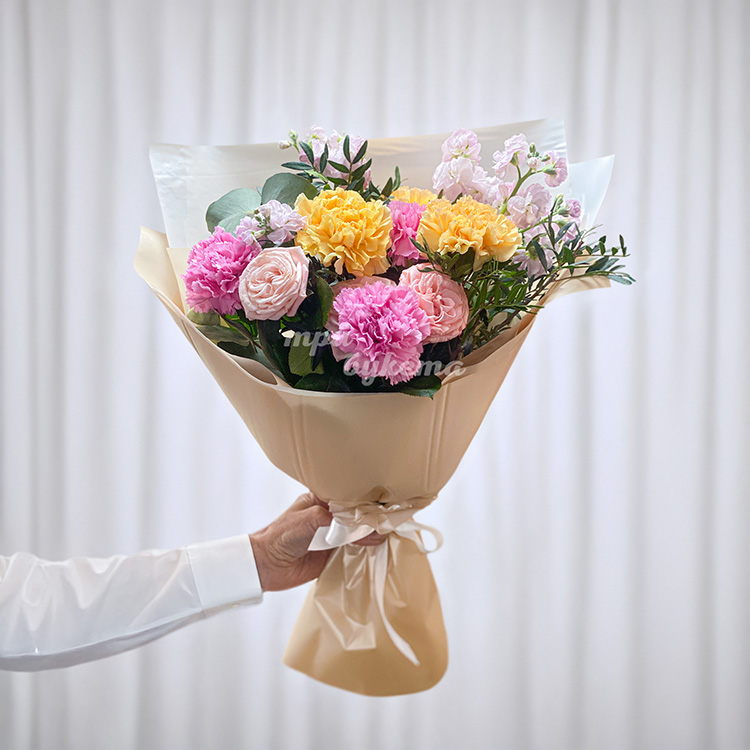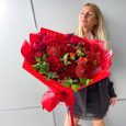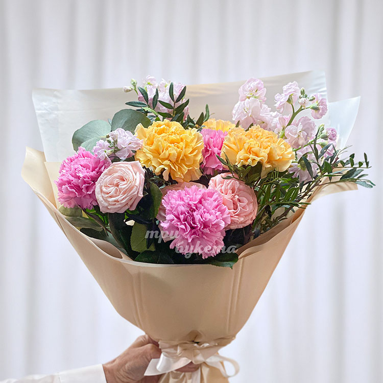 Букет ярких гвоздик, роз и маттиол
