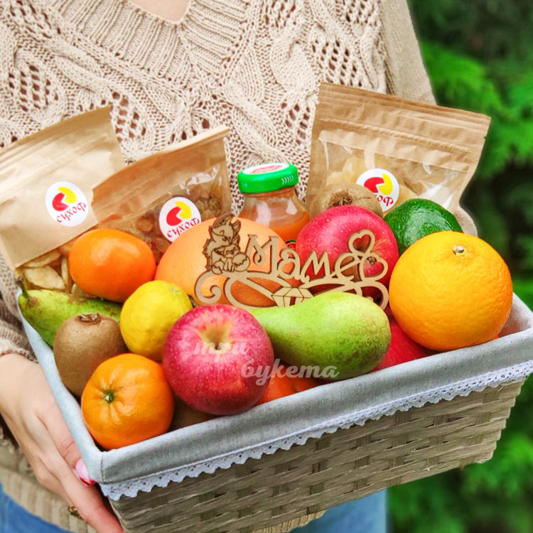 Фрукты и сухофрукты в корзине для мамы
