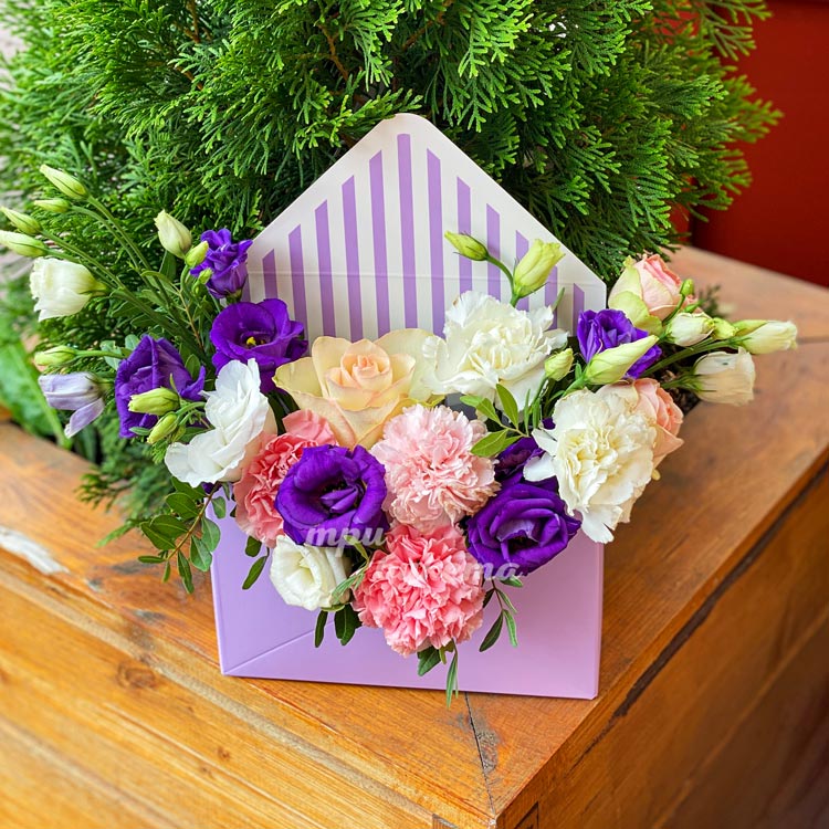 Коробочка с эустомами и гвоздиками
