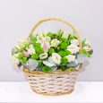 Корзина белых хризантем, орхидей и эустом