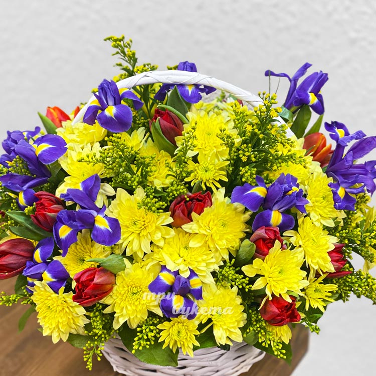 Корзина ирисов и хризантем