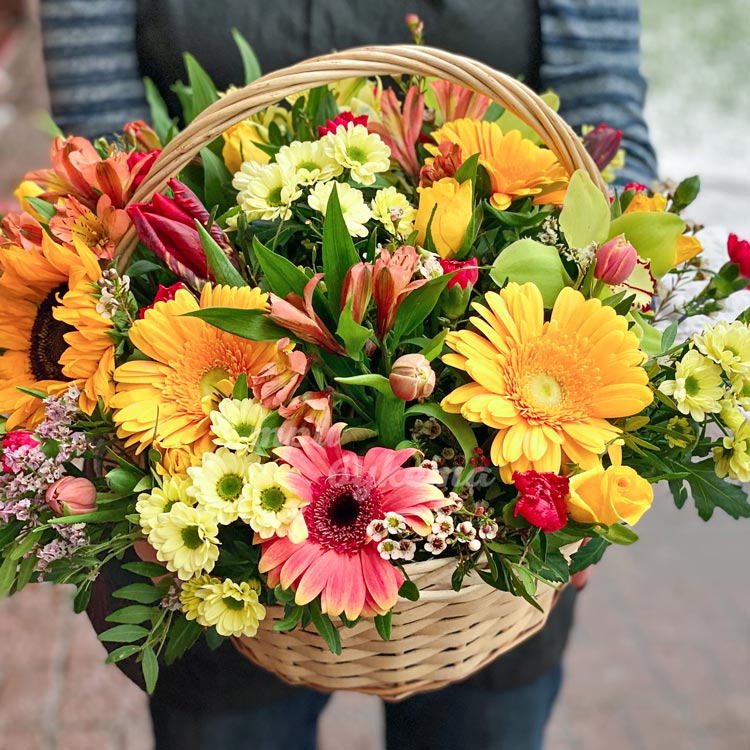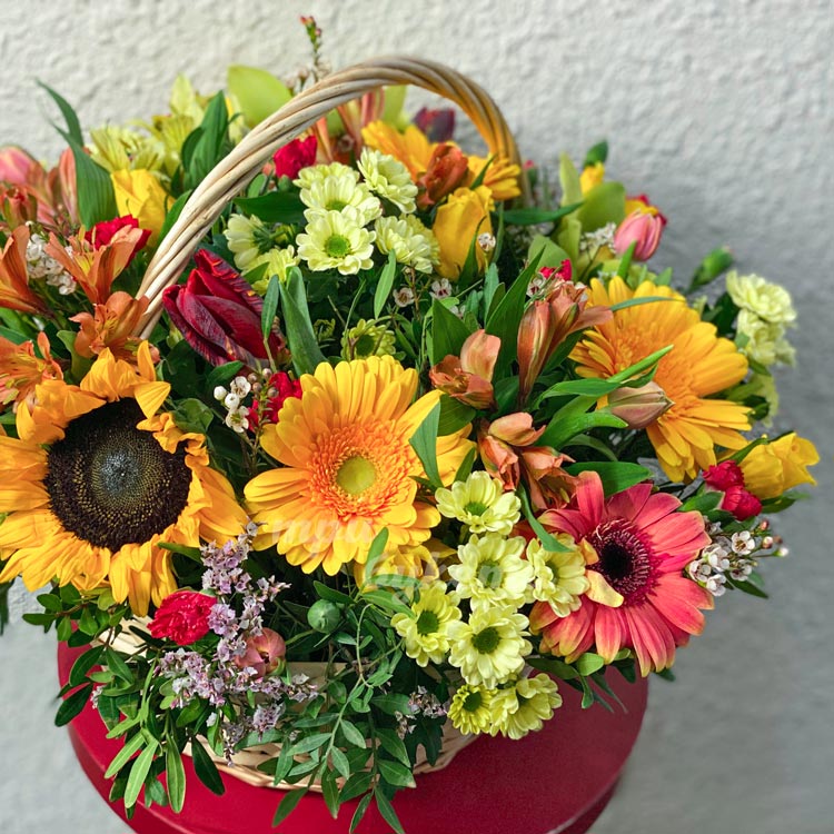 Корзина хризантем с подсолнухом