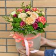 Красные розы и желтые орхидеи в ящичке