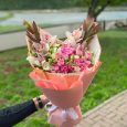 Пышный розовый букет роз и хризантем