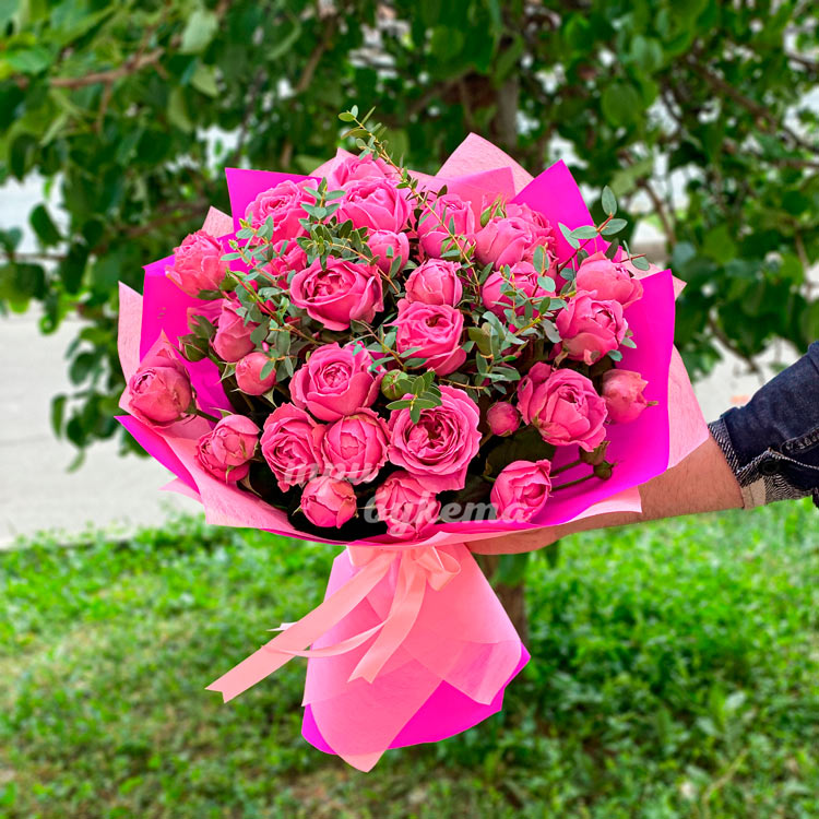 Розовый букет пионовидных роз с эвкалиптом
