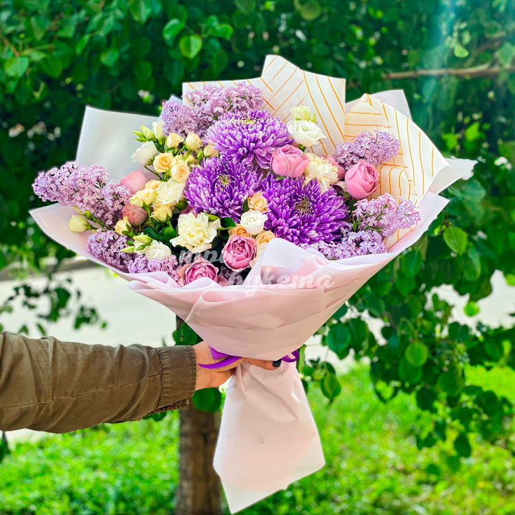 Сиреневый букет хризантем, роз и сирени